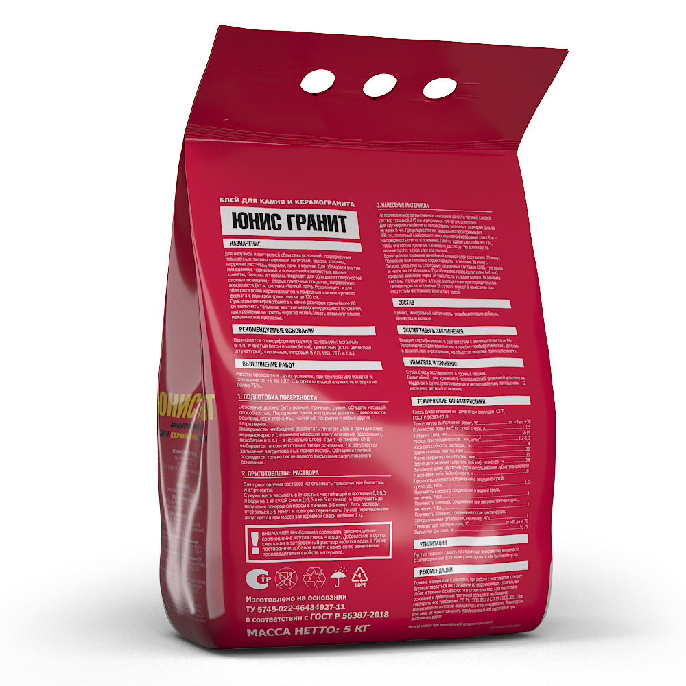 Рекомендуется для облицовки полов керамогранитом и природным камнем крупного формата с размером грани плитки до 120 см. Приклеивание керамогранита и камня с размером грани более 60 см выполнять только на жесткие недеформирующиеся основания, при креплении на цоколь и фасад использовать вспомогательное механическое крепление.