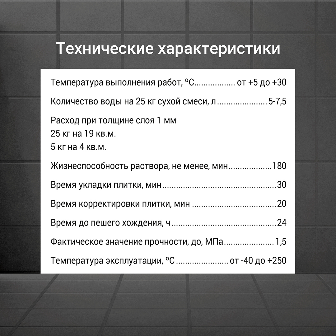 Термостойкий плиточный клей для различных нагреваемых поверхностей: системы «Тёплого пола», внешних поверхностей печей и каминов. Клей обеспечивает надежное клеевое соединение при постоянном воздействии температуры +150 °С и выдерживает кратковременный нагрев до +250°С.