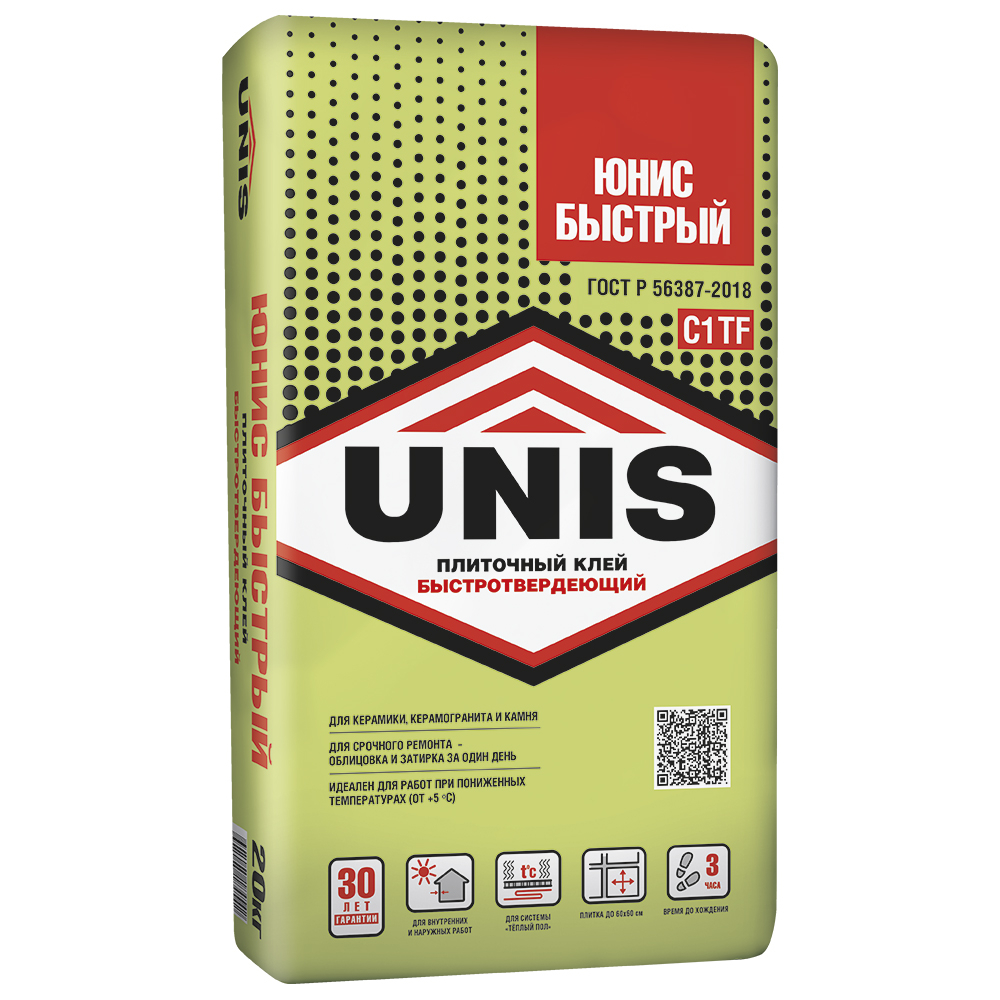 «ЮНИС БЫСТРЫЙ» рекомендуется для сложных задач: для системы «Тёплый пол», для крепления керамогранита на фасад, укладки поверх старой плитки («плитка на плитку»), укладка плитки на цементную гидроизоляцию.