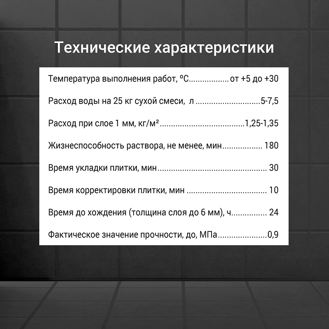 Для укладки всех видов керамической плитки с нормальным водопоглощением (более 5%) размером до 45х45см на полы и стены внутри сухих, влажных, отапливаемых и неотапливаемых помещений.