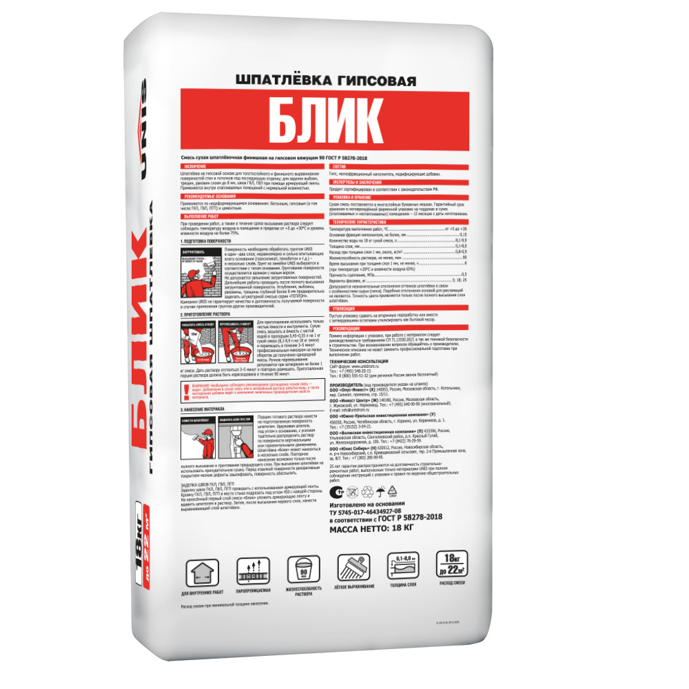 Шпатлёвка на гипсовой основе для толстослойного и финишного выравнивания поверхностей стен и потолков под последующую отделку; для заделки выбоин, трещин, раковин слоем до 8 мм, швов ГКЛ, ГВЛ при помощи армирующей ленты. Применяется внутри отапливаемых помещений с нормальной влажностью.