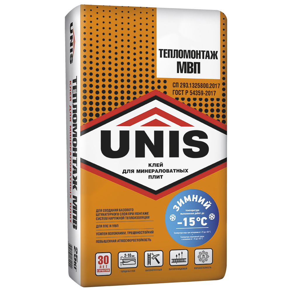 Для крепления минеральноватных теплоизоляционных плит. Для внутренних и наружных работ на объектах индивидуального жилого строительства. Для создания на поверхности теплоизоляционных пенополистирольных плит базового штукатурного слоя (с использованием фасадной стеклосетки) следует применять UNIS Теплофасад или UNIS Теплофасад S.