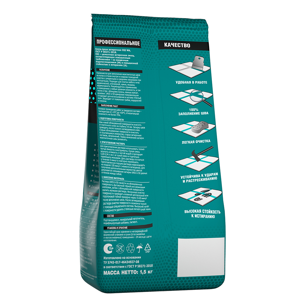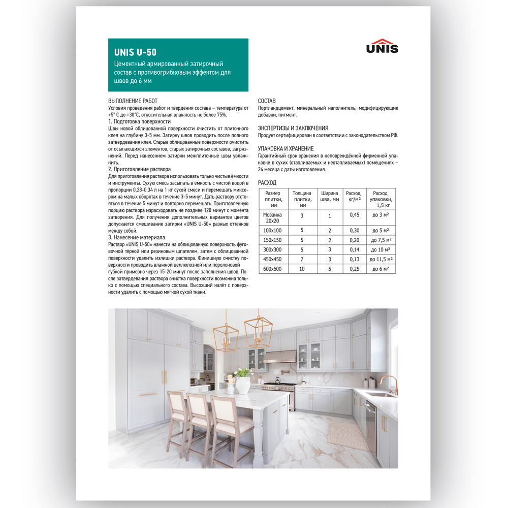 Применяется для заполнения межплиточных швов на полах и стенах внутри и снаружи помещений в местах с умеренными и средними нагрузками при эксплуатации. Подходит для плитки любого типа: керамической, клинкерной, камня, мозаики, керамогранита. Рекомендуется к применению в помещениях с любым уровнем влажности, в том числе и при облицовке кухонь, ванных комнат, душевых. UNIS U-50 армирован микроволокном и подходит для использования в системе «Тёплый пол». Защищает от появления грибка, водорослей и плесени.