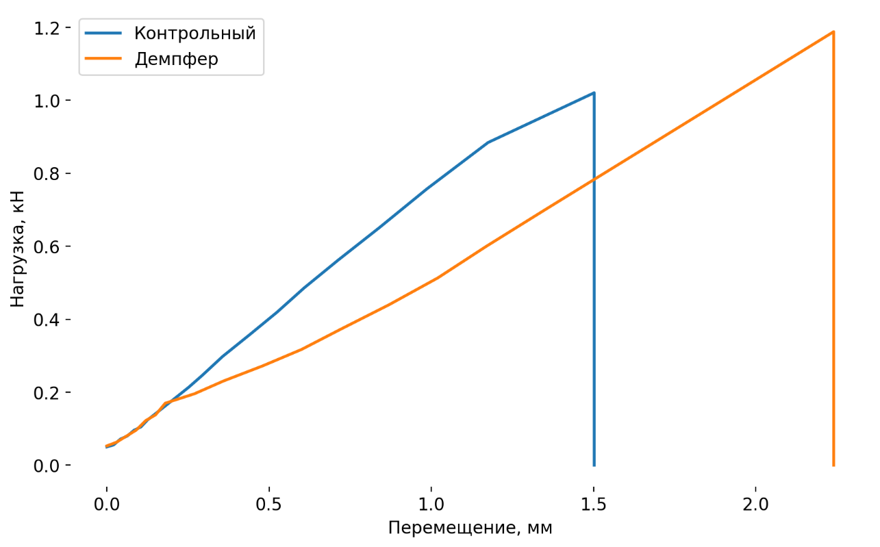 Рисунок 1 – Обобщенный график зависимости перемещения от приложенной нагрузки серий образцов при осевом растяжении.